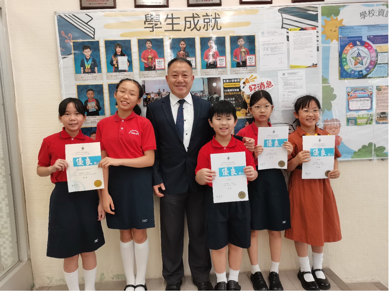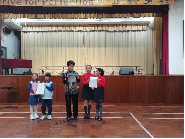 校長與獲得第76屆香港校際朗誦節普通話亞軍及季軍的同學合影留念